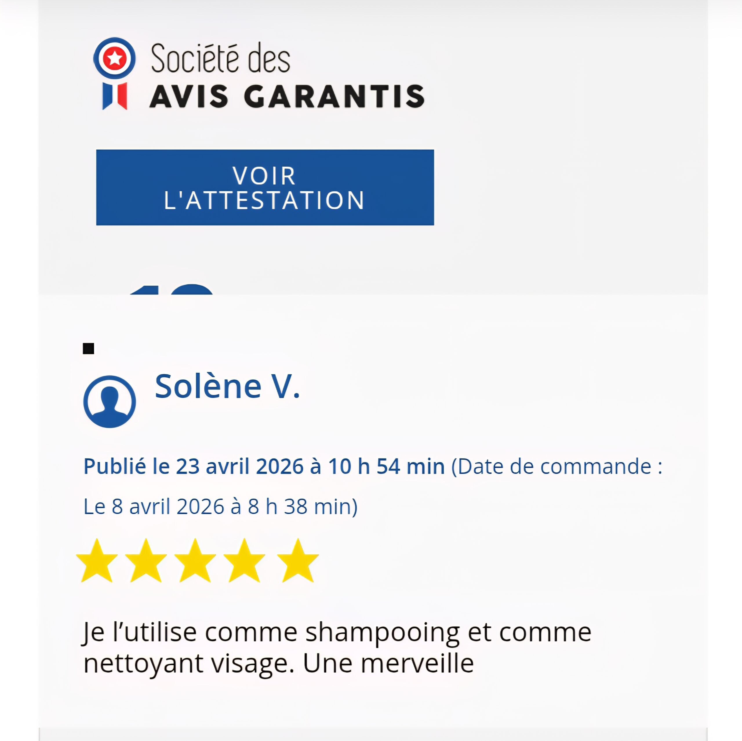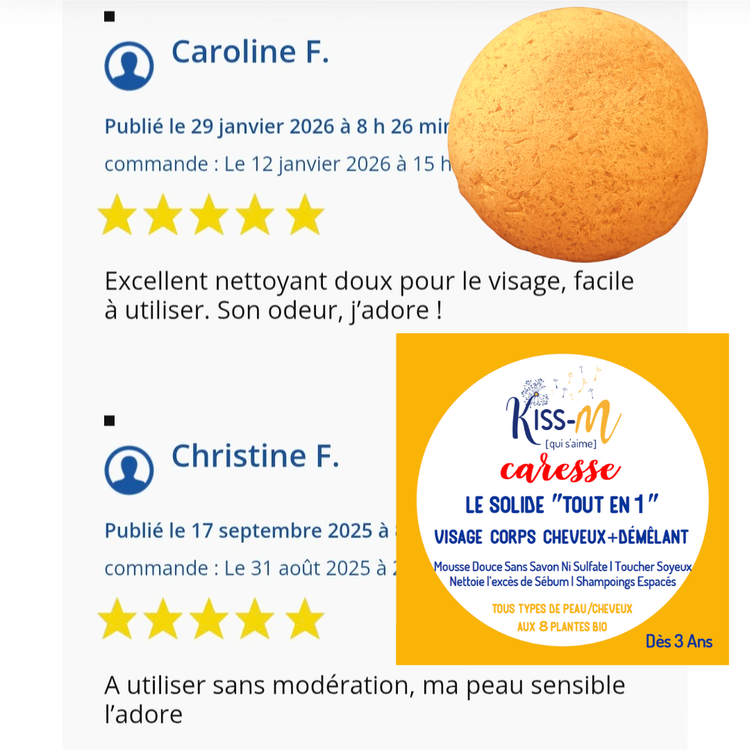Et CARESSE, c'est 100% d'avis clients 5🌟 y compris les cheveux bouclés et peaux sensibles (eczéma, dermite, pellicules, plaques, démangeaisons) ou dans le cas de chimiothérapie (chute de cheveux). Teste le mini 24G (8 utilisations cheveux "shampoing solide après-shampoing" ou 4 mois en nettoyant visage). À retrouver en pack (jusqu'à -10%) ✌️