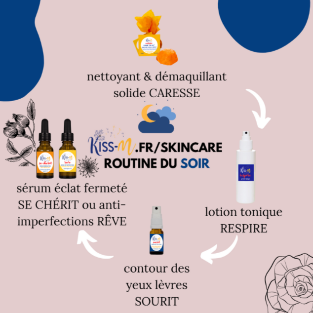 À NOTER : Les propriétés, indications et modes d’utilisation des ingrédients des soins sont tirés d’ouvrages de référence en aromathérapie, hydrolathérapie, phytothérapie et/ou de publications scientifiques. Ces informations sont données à titre indicatif et informatif. Elles ne sauraient en aucun cas constituer une information médicale et encore moins s’y substituer. Elles n’engagent donc en rien la responsabilité de Kiss-M. Pour tout usage dans un but thérapeutique, merci de consulter un professionnel de santé.