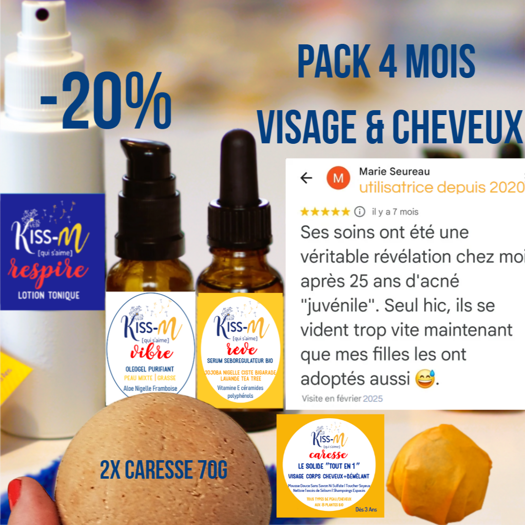 Nettoyant, hydratation et soin CARESSE #BESTSELLER Kiss-M Shampoing solide après-shampoing « 2 en 1 ». Convient aux femmes enceintes et aux enfants dès 3 ans. Pratique, écologique, économique : 1 SEUL lavage suffit. Et grâce à sa formule équilibrée, enrichie en beurre de karité bio et 7 autres plantes biologiques, CARESSE nettoie le cuir chevelu sans l’assécher, élimine l’excès de sébum et apaise les démangeaisons. Plaques, eczéma, PELLICULES, squames disparaissent. Et comme il regraisse moins vite, on ESPACE les shampoings. Un + quand on fait des colorations végétales ou qu’on les perd. Les cheveux sont brillants, légers, avec un beau volume en racines, doux, gainés, y compris les cheveux (Dé)COLORéS et BOUCLéS.